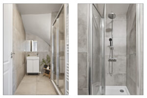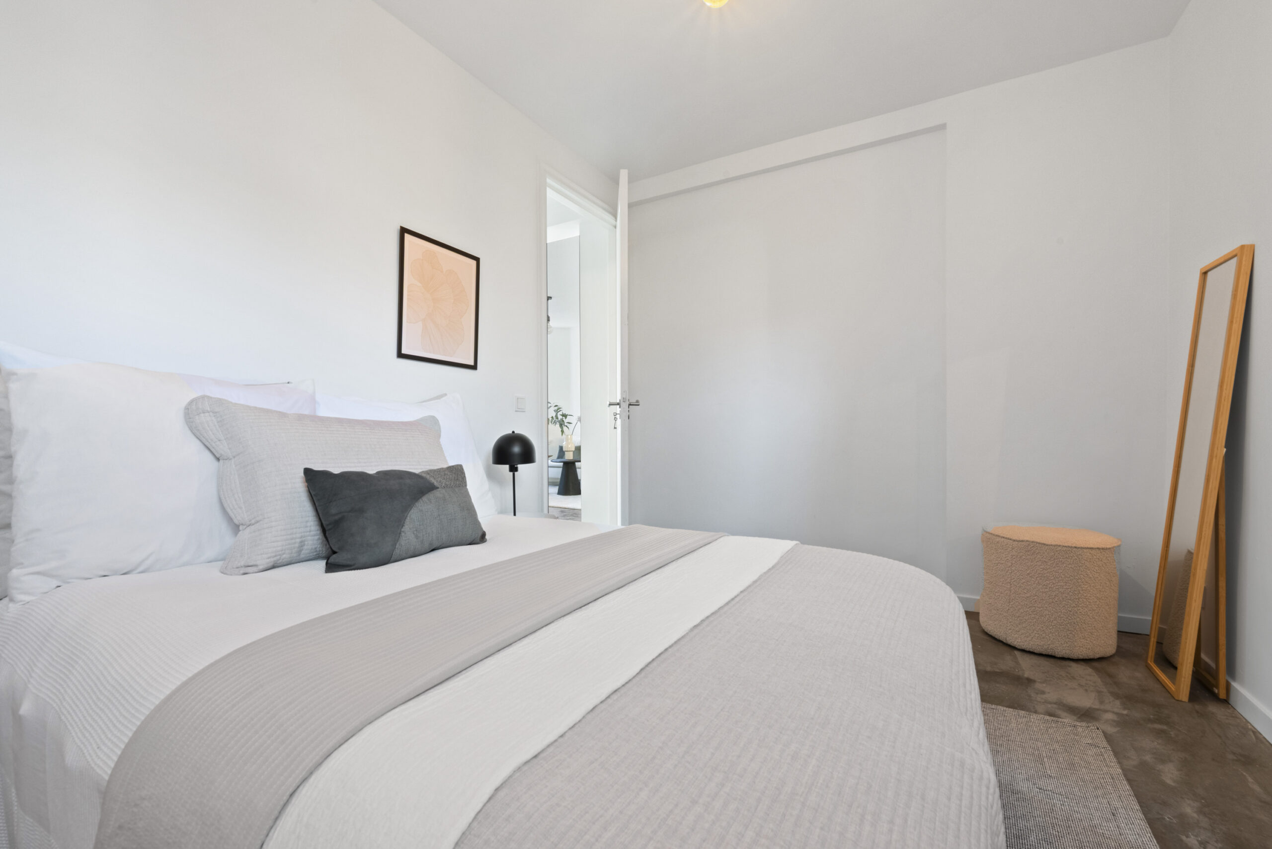 Aan de achterzijde ligt de slaapkamer. De badkamer is uitgerust met een douche, wastafelmeubel en aansluitingen voor wasmachine/droger.