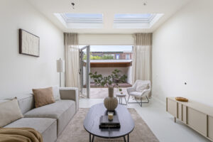 The property features underfloor heating on all levels with zone control, sleek plastered walls and ceilings, a contemporary kitchen, and modern bathroom facilities. Additionally, it includes a sunny garden and a spacious rooftop terrace.