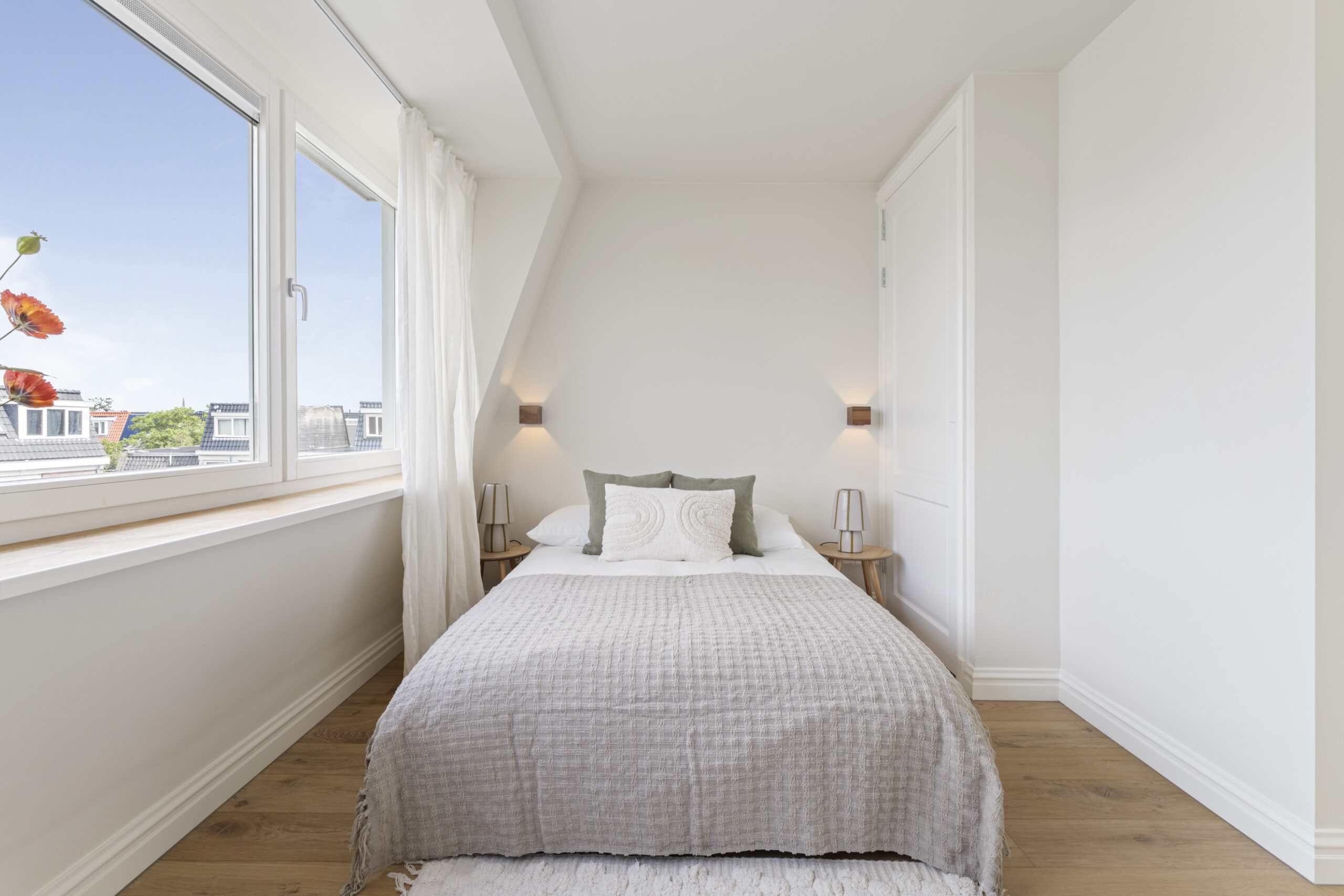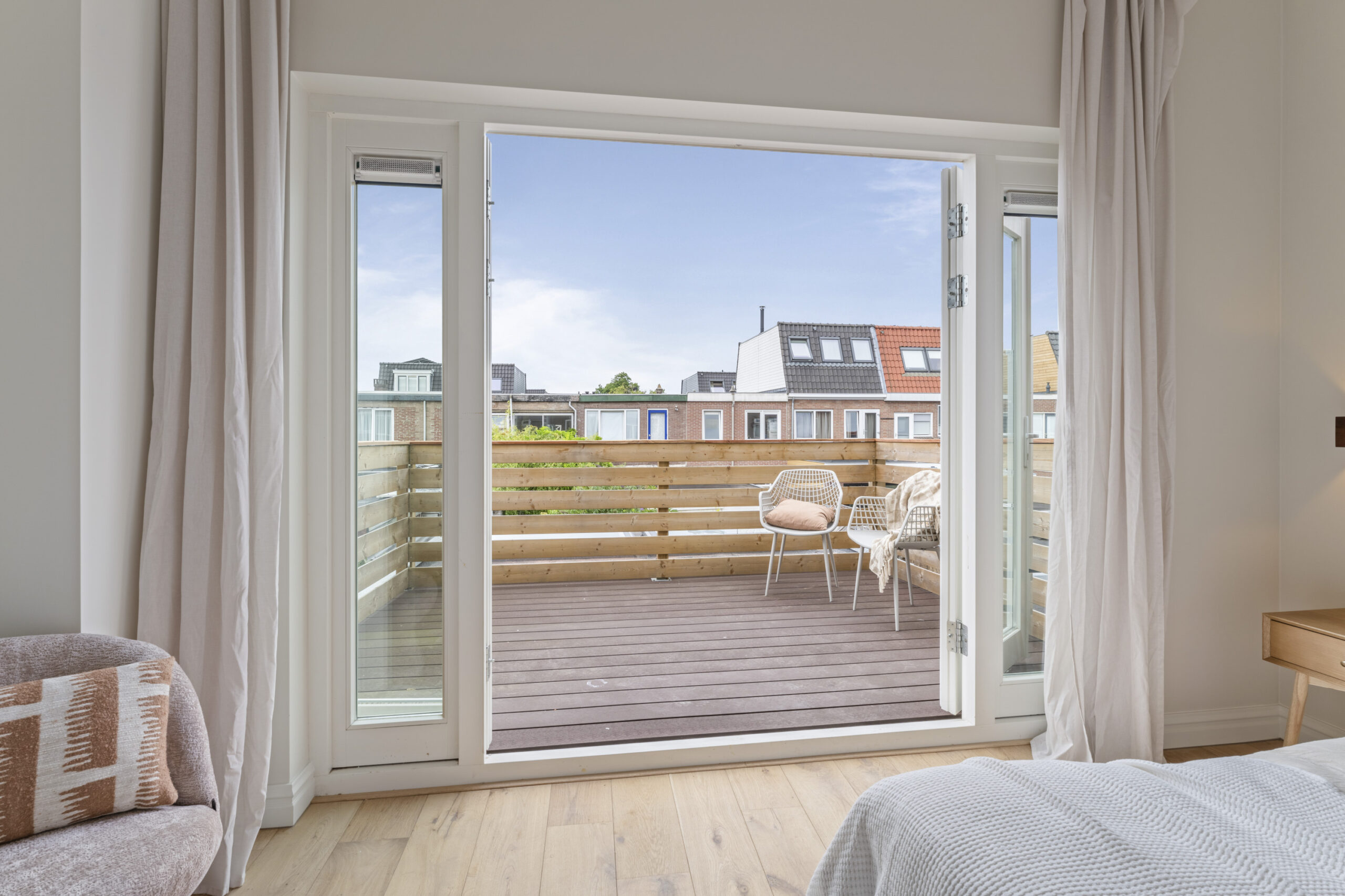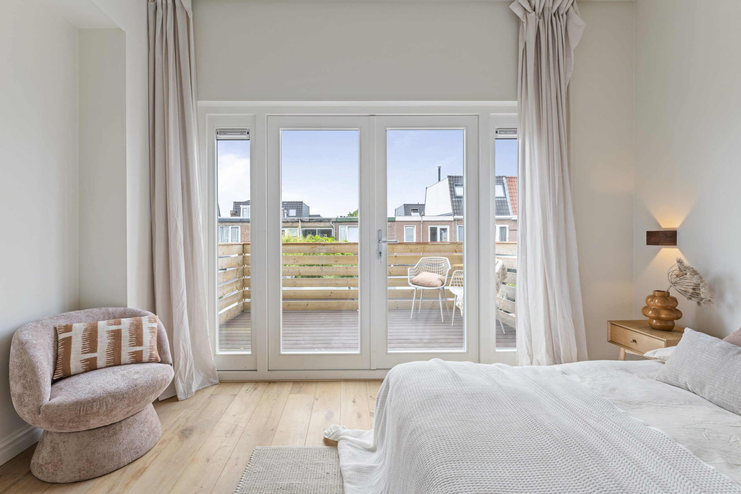 Eerste verdieping: Overloop, twee ruime slaapkamers waarvan één met openslaande deuren naar het dakterras, en een moderne badkamer.